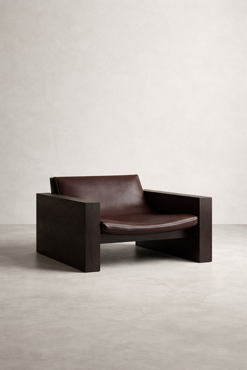 Carved from solid smoked oak and paired with tensioned full-grain leather, the form feels architectural and grounded. Thick monolithic sides create a sculptural presence, while the suspended leather seat softens the silhouette with effortless comfort.