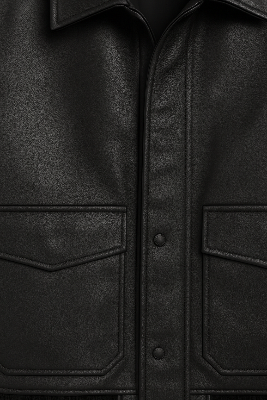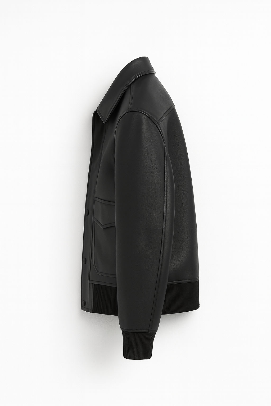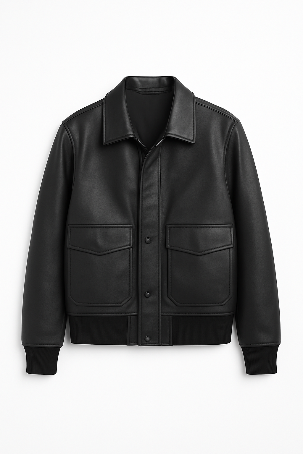 Premium black genuine leather bomber jacket with utility pockets, ribbed cuffs, and a clean modern fit. A luxury wardrobe staple built to last.