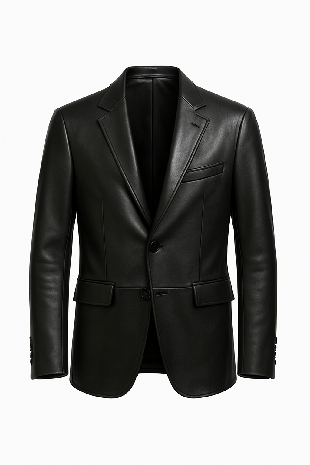 A sharp, minimal black leather blazer made from real leather. Designed with a clean tailored fit, a two-button front, notch lapels, and welt pockets. The jacket has a smooth matte finish and a structured silhouette that works for both formal and smart-casual outfits. Fully lined for comfort and finished with tonal stitching and button cuffs. A polished upgrade for everyday or evening wear.