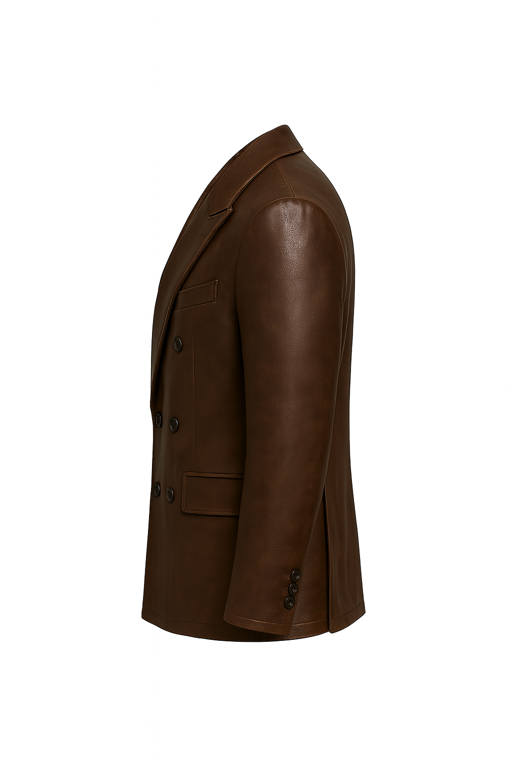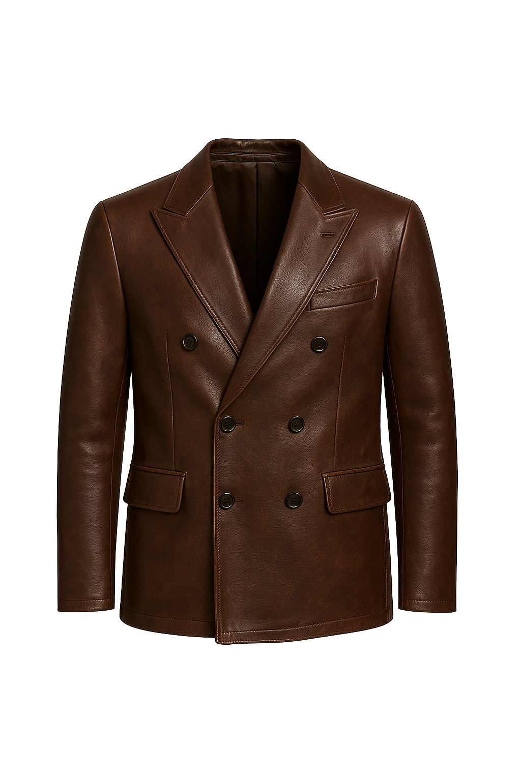 A premium double-breasted leather blazer in espresso brown, designed with peak lapels and a structured modern fit. Clean, refined, and effortlessly sophisticated.