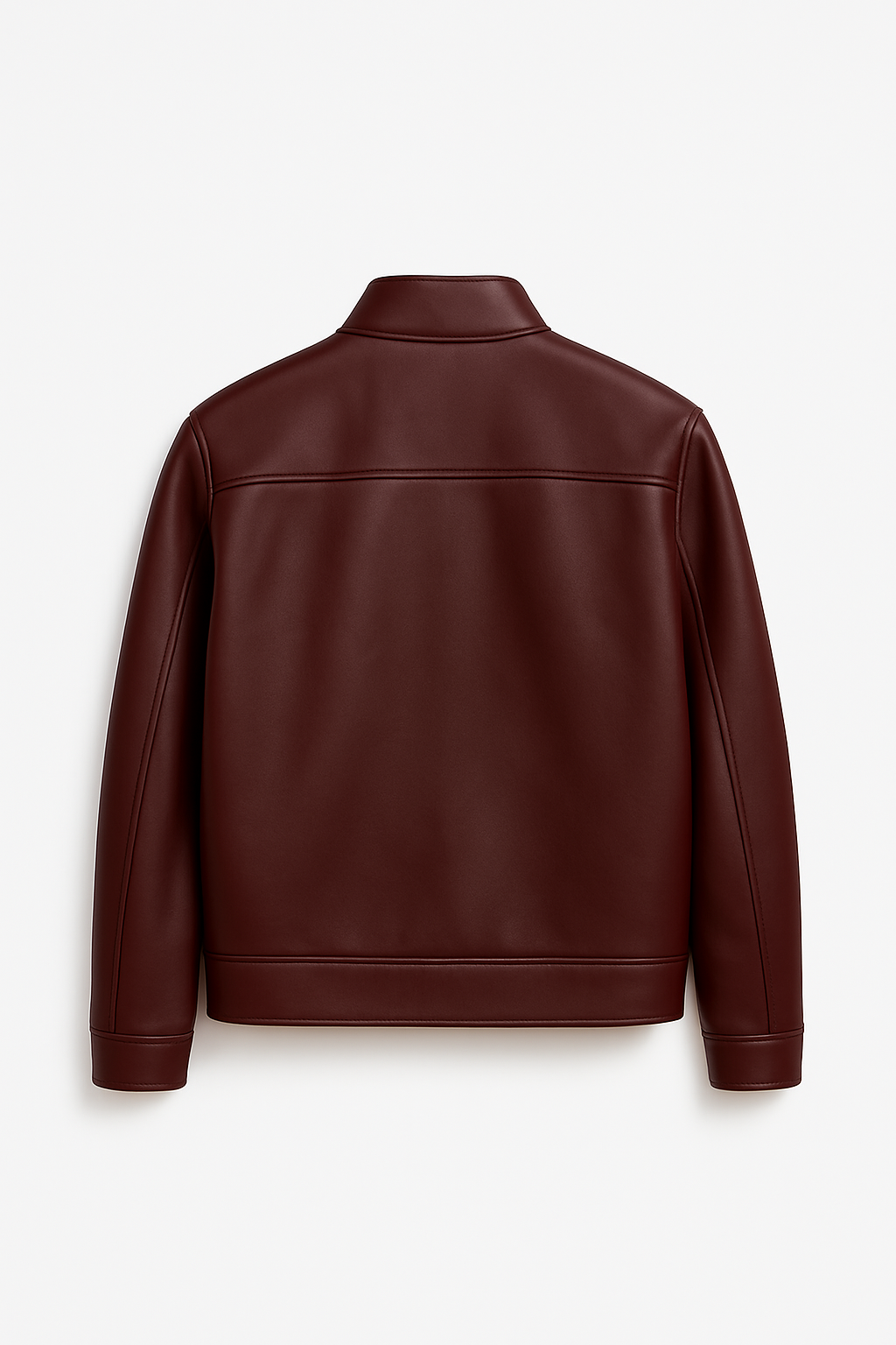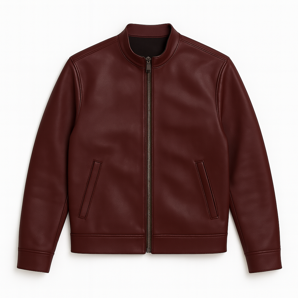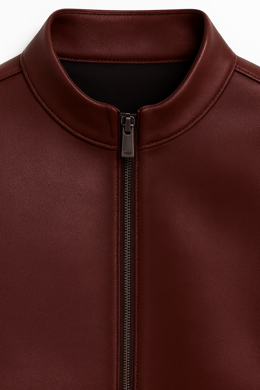 A clean, relaxed-fit leather jacket in deep burgundy. Designed with a sleek stand collar, smooth two-way zipper and subtle welt pockets. Made from full-grain lambskin with a soft matte finish for a modern, premium feel.