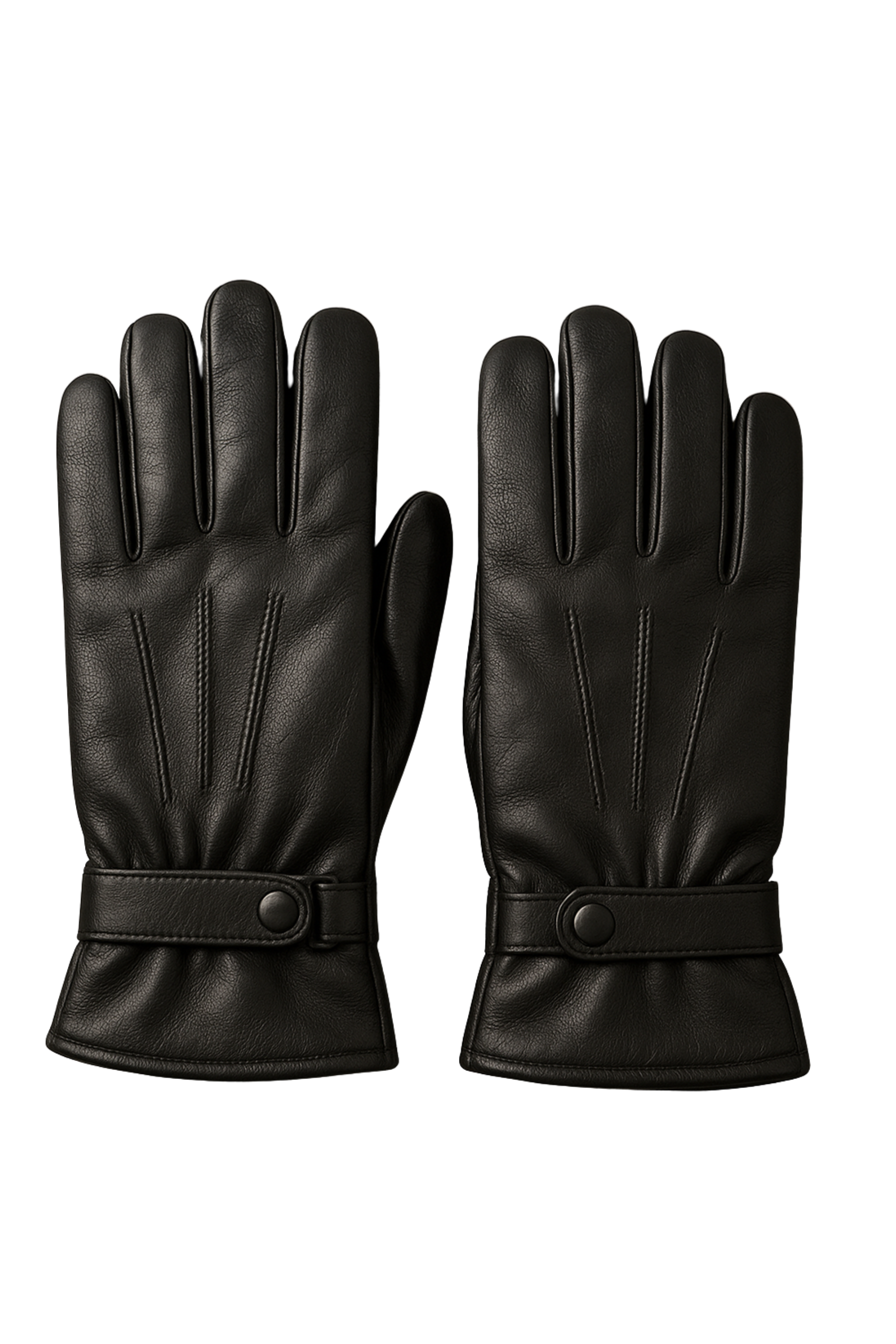 Premium black leather gloves with insulated lining, three-line stitching, and an adjustable snap-tab wrist—warm, elegant, and perfect for winter.