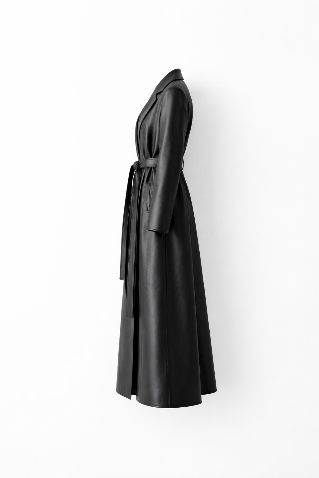 The Nero Forma Coat is cut from couture-grade plongé lambskin — a leather so soft it moves like fabric. Designed with Italian tailoring proportions, it drapes effortlessly over the body, creating a long, clean silhouette with subtle structure and fluid movement.
