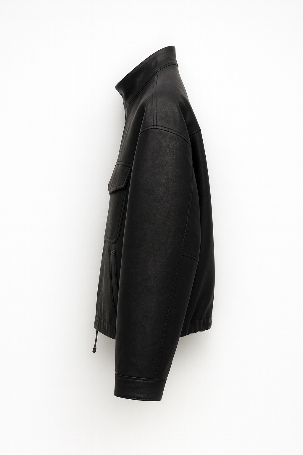 A clean, oversized faux-leather jacket with a soft matte finish. It has dropped shoulders, long straight sleeves, and a slightly cropped cut that works with high-waisted pants or skirts. The chest flap pockets and slanted side pockets add a quiet utility feel. The stand collar stays neat zipped up or relaxed when open. A hidden drawstring at the hem lets you keep the shape boxy or slightly cinched. It’s a simple, modern layer with a Seoul-inspired edge.