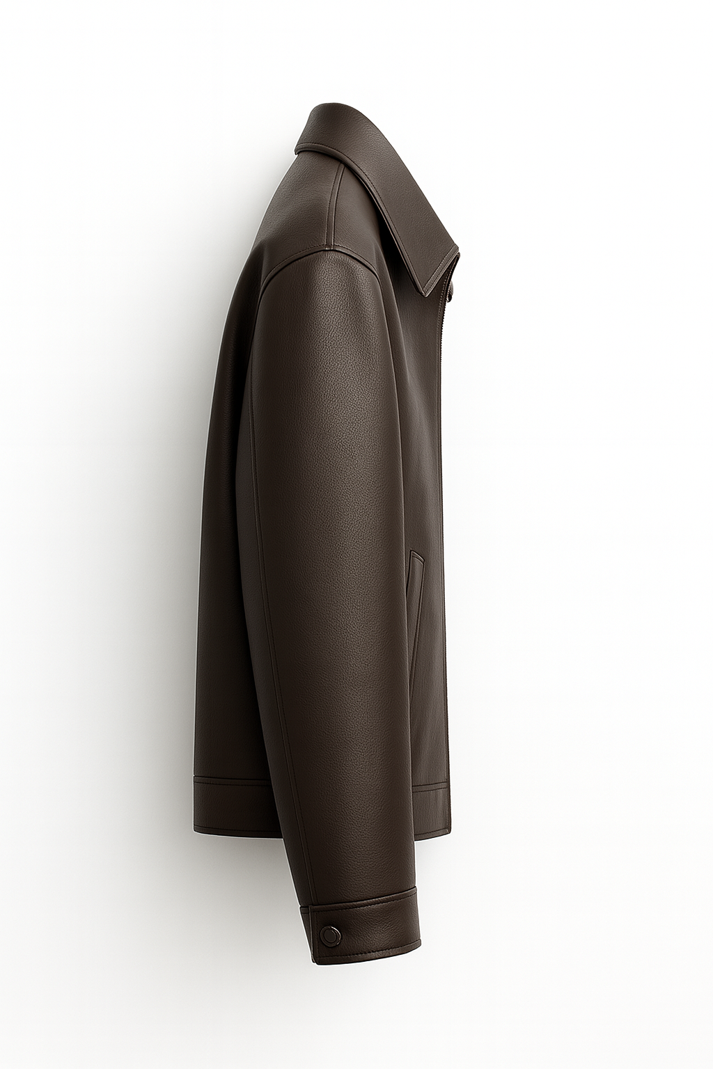 A soft, mocha-brown leather jacket designed with a clean, Korean-inspired look. The fit is relaxed but neat, hitting right at the hip for balanced proportions. The wide, structured collar gives it a modern touch while keeping the silhouette minimal. Vertical welt pockets keep the front smooth and simple, and the straight zip closure adds to the clean lines. It’s an easy, polished layer that works with everything from wide-leg trousers to a fitted knit dress.