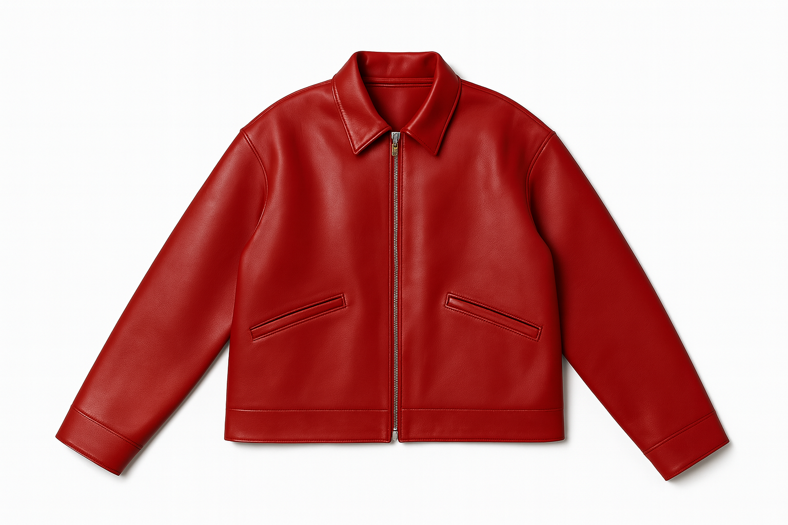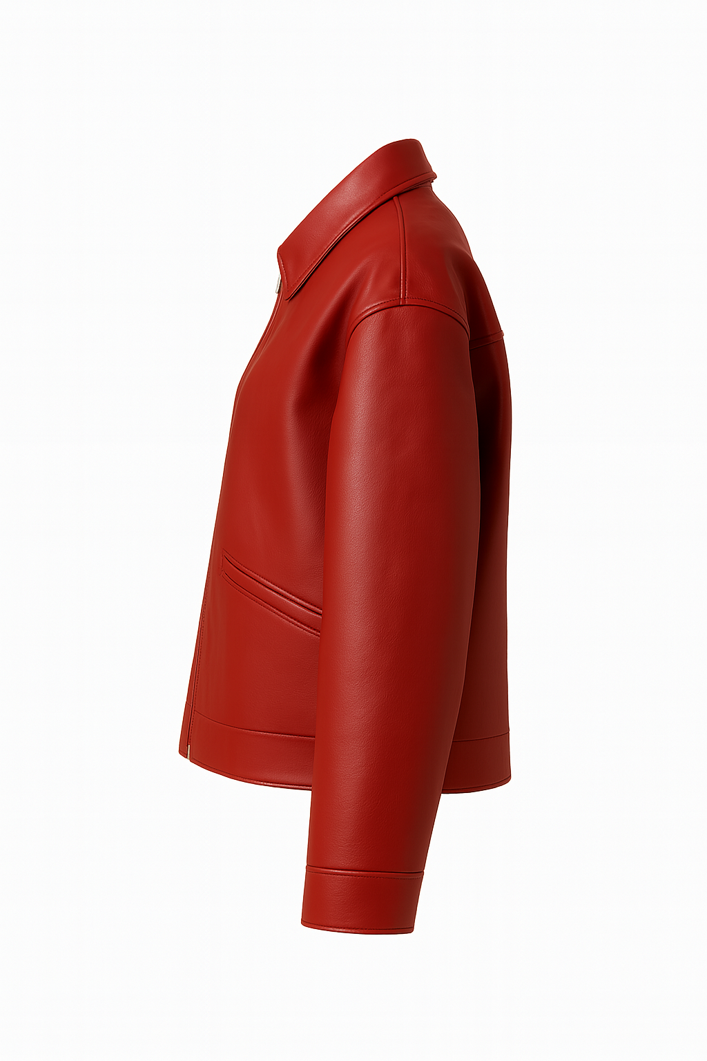 Women’s red leather jacket made from smooth genuine leather. Features a clean zip front, sharp collar, welt pockets and a straight modern silhouette. Structured, comfortable and easy to style. A bold, minimal outerwear piece for everyday wear.