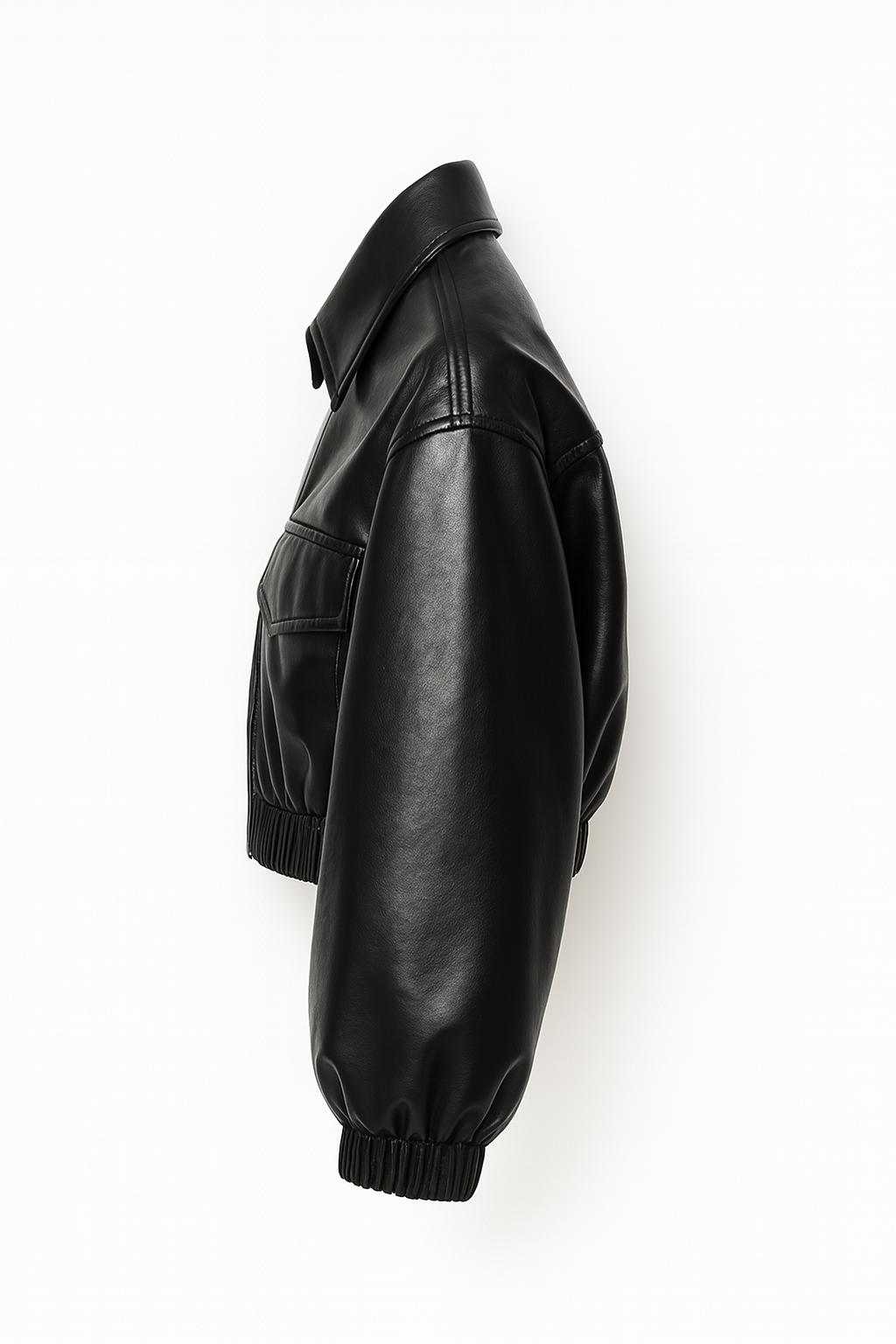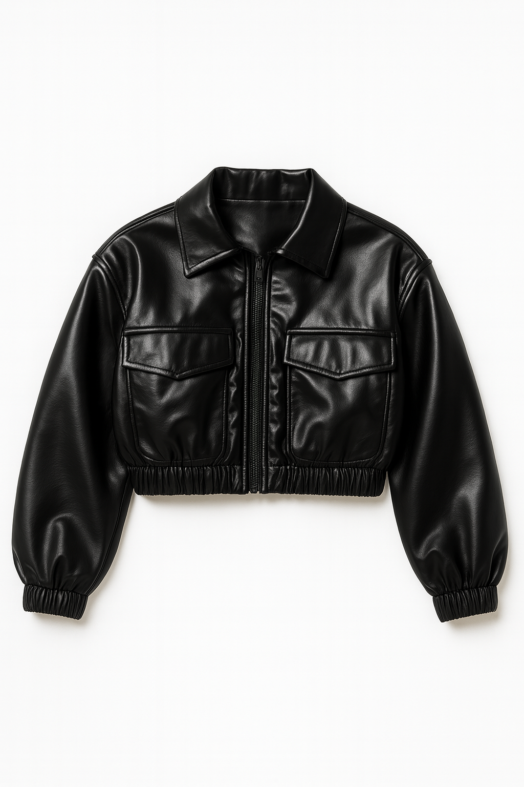 A sleek glossy black cropped leather jacket with a clean shape and a modern finish. The elastic hem and cuffs give it a sharp, sculpted fit, while the utility flap pockets add a simple functional detail. It zips smoothly through the front and sits right at the waist for a polished, easy look. A bold piece that works with denim, cargos, skirts, or layered night-out outfits.