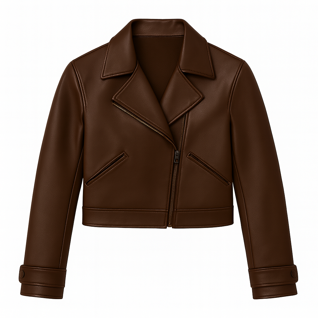 A sharp, cropped moto jacket in smooth brown genuine leather. The cut is clean and modern with an angled front zip, wide lapels, and welt pockets. The fit sits above the waist for a structured look without feeling tight. Finished with tonal stitching and snap-button cuffs.