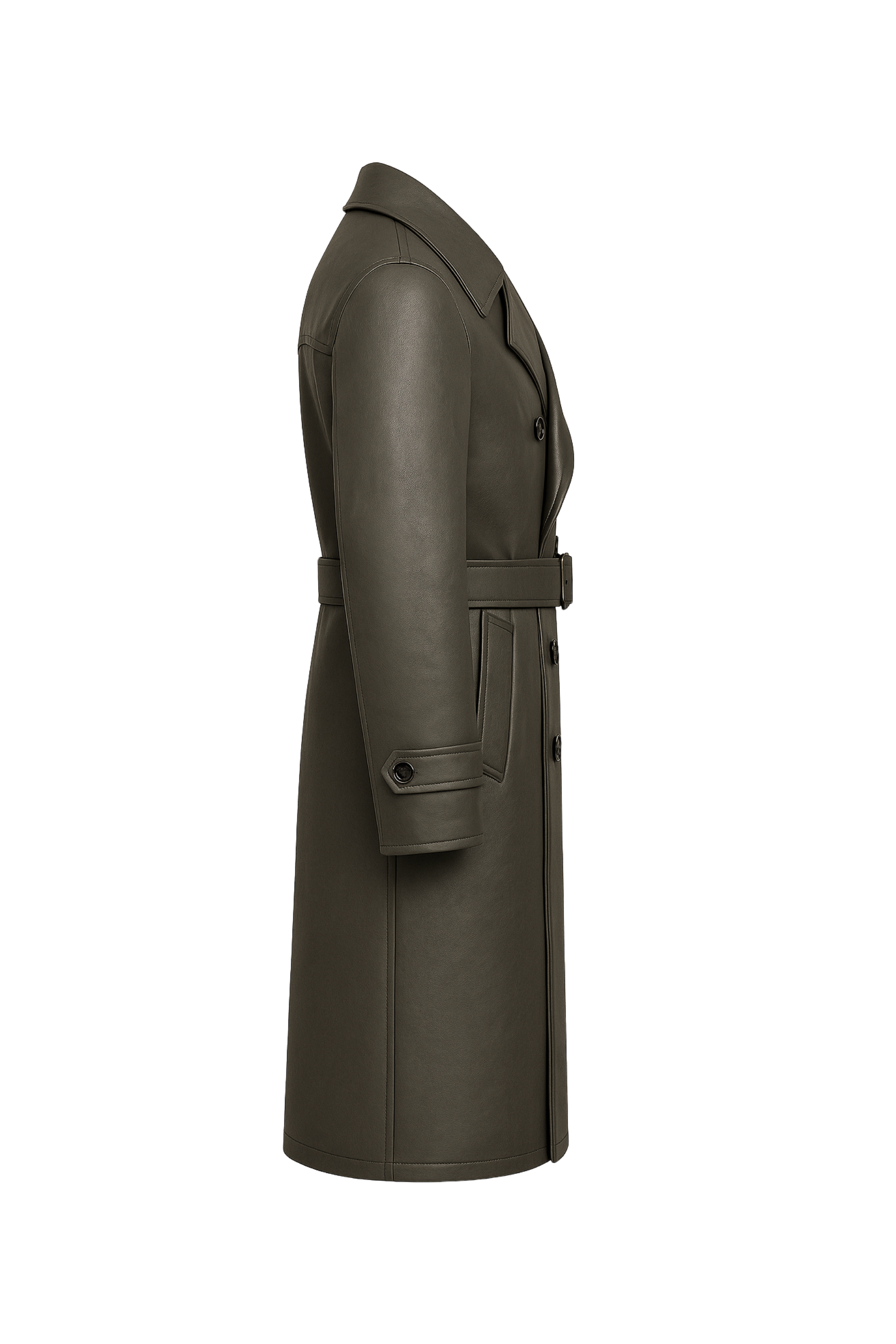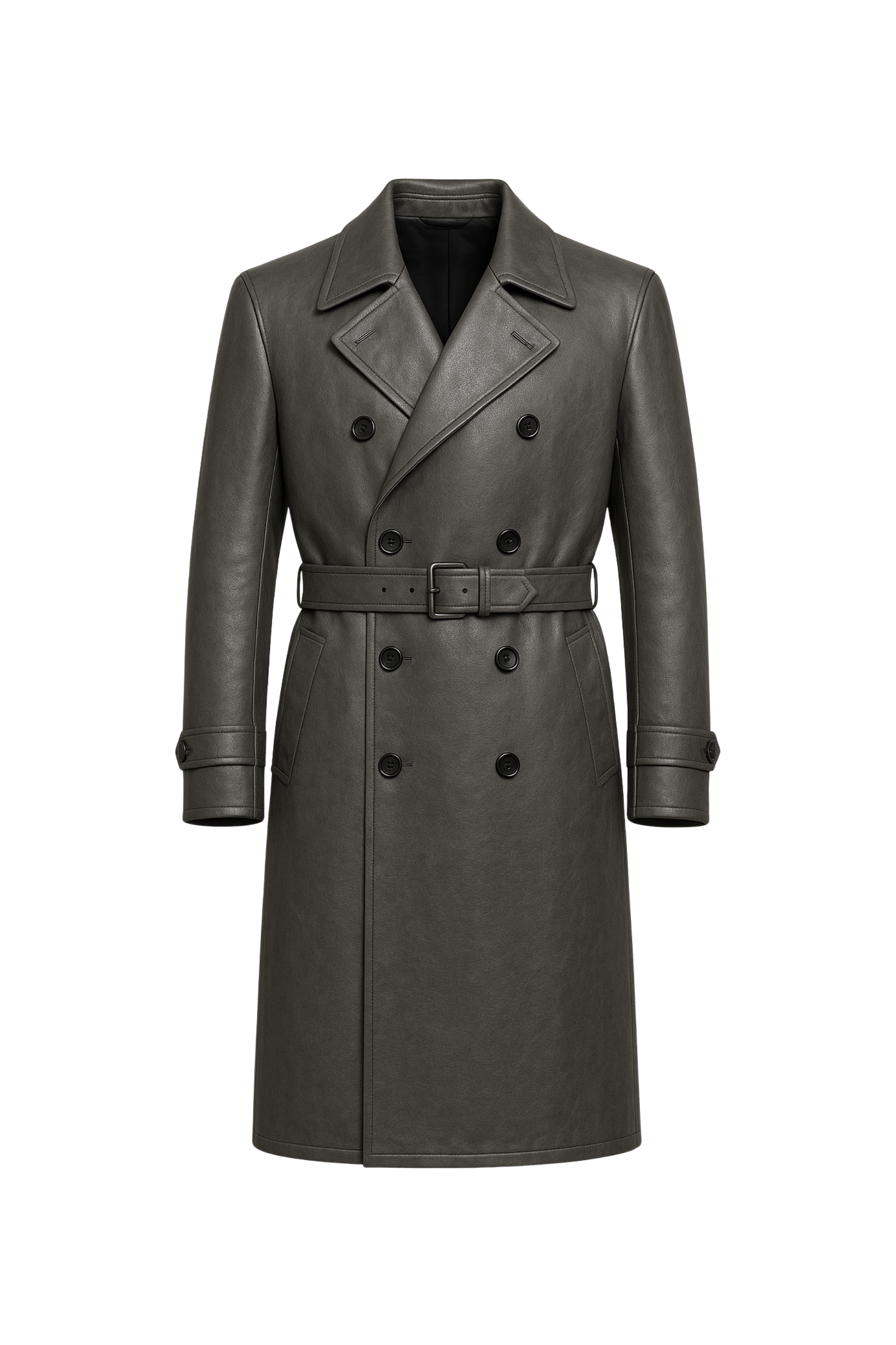 A powerful blend of craftsmanship and understated opulence—this charcoal leather trench coat is designed for the man who moves with quiet confidence.