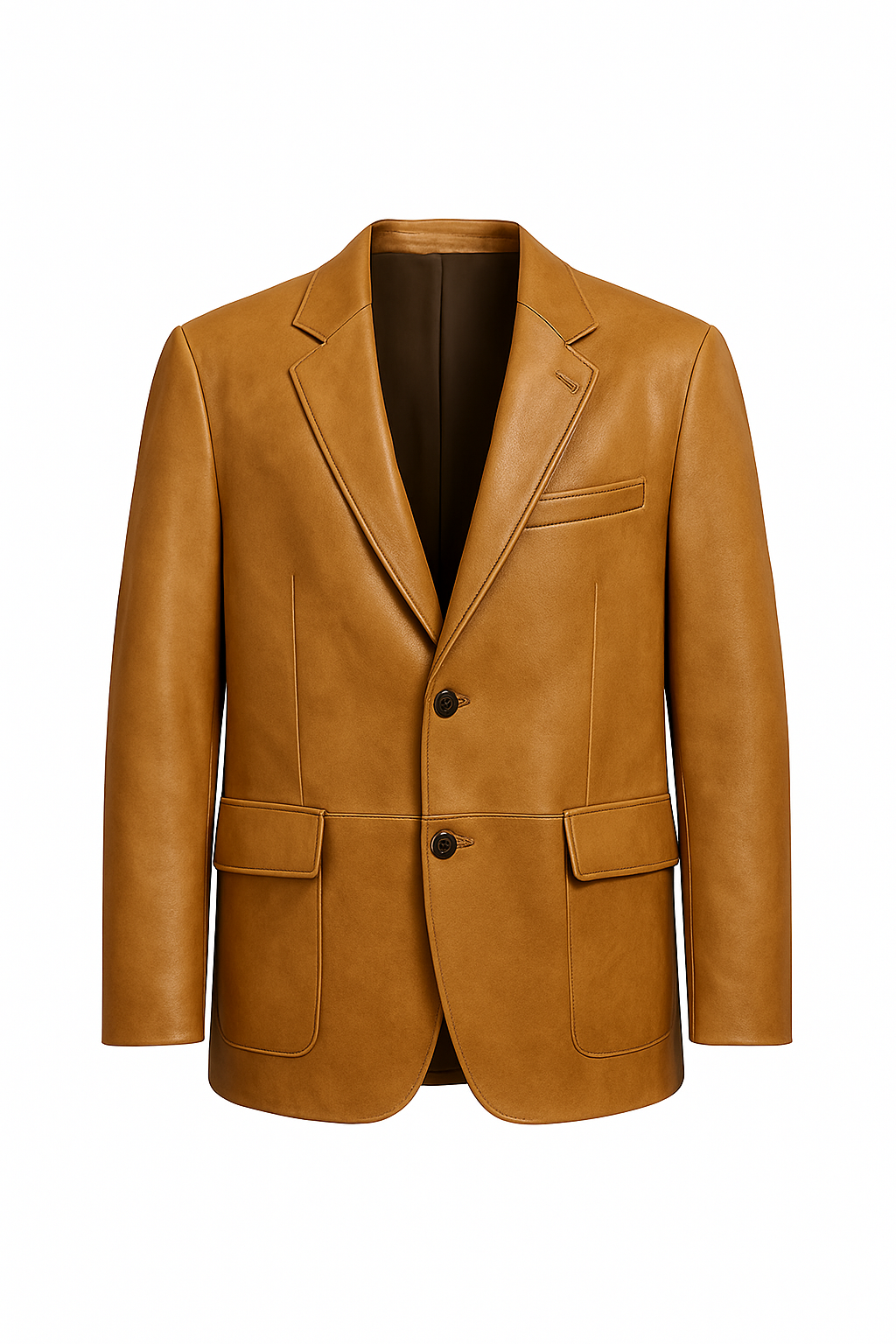 A beautifully crafted caramel leather blazer designed with precision, elegance, and the quiet confidence of true luxury.