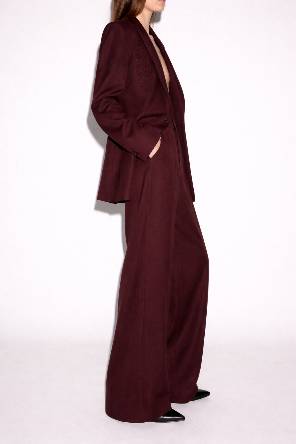 Women’s deep bordeaux smoke tailored suit crafted from wool-silk twill, compact crepe, or superfine wool gabardine with an ultra-matte finish. Features an oversized relaxed blazer with elongated proportions, natural shoulders, wide sculptural lapels, and wide-leg trousers with fluid drape. Signature tone-on-tone embroidery in a darker bordeaux thread runs from shoulder through lapel using matte flat-stitch technique for a subtle couture effect. Designed to absorb light for a rich, smoked finish with quiet runway authority.