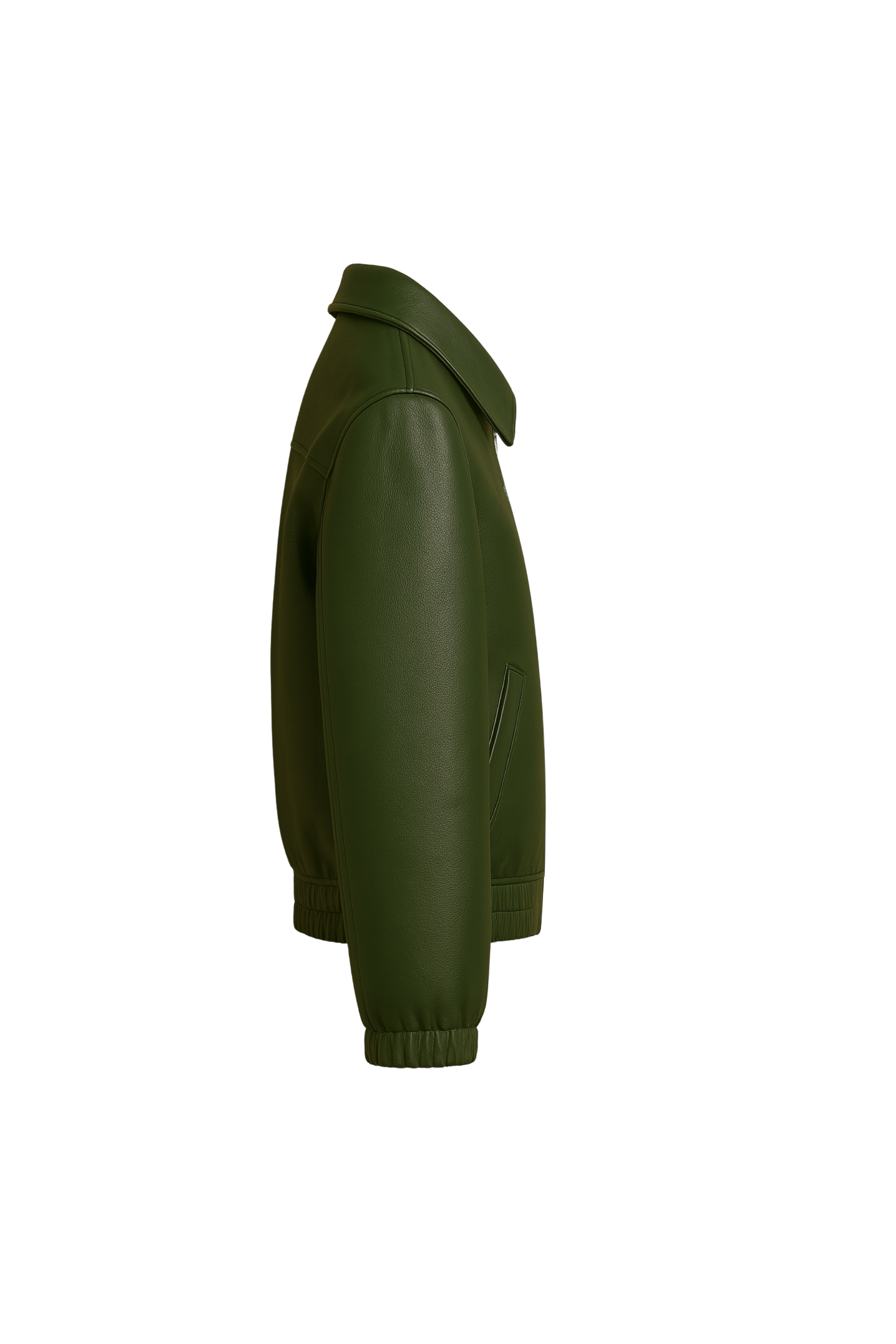 A sleek women’s forest-green faux leather bomber with a flattering relaxed fit, structured collar, and chic zip front. Modern, soft, and easy to style.